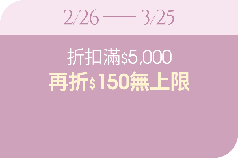 - 全館單筆折扣後,滿 NT$5,000 立即折抵 NT$150;滿 NT$10,000 現抵 NT$300;滿 NT$15,000 現抵 NT$450。實際結算金額,為系統自動計算是否達到滿額優惠門檻,或以現場結帳為準。